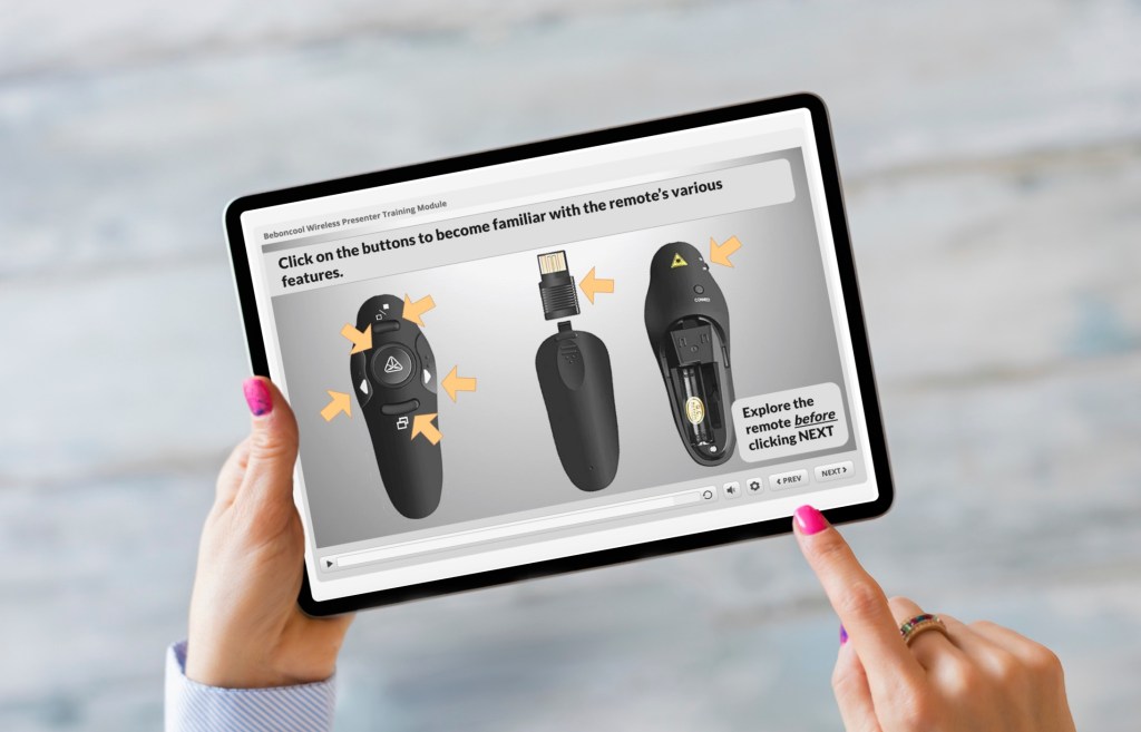 Created back in 2020, this training module explains and showcases Beboncool’s Wireless Presenter. It provides interactive eLearning activities and helpful visuals to guide someone through the features of the remote and how to best use it during a presentation.
